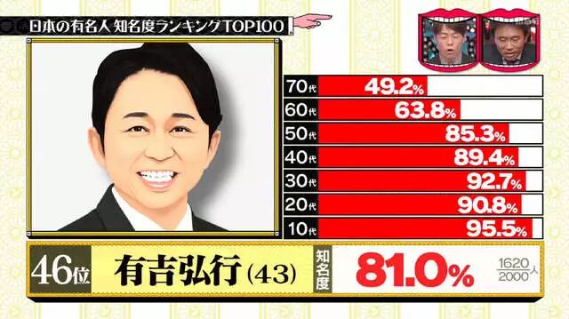 大家很熟悉的搞笑艺人有吉弘行排位也在这个区间内,毒舌大师排名也很高呀。