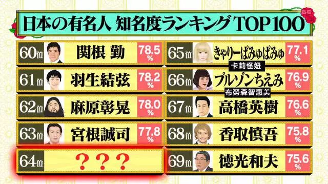 69到60中,今年因为“35亿人”梗走红的搞笑艺人智惠美高居第66,还有前SMAP成员香取慎吾、老牌演员高桥英树与关根勤、主持人德光和夫与宫根诚司,制造出沙林毒气事件的邪教组织奥姆真理教的创始人麻原彰晃也依然被人记住。