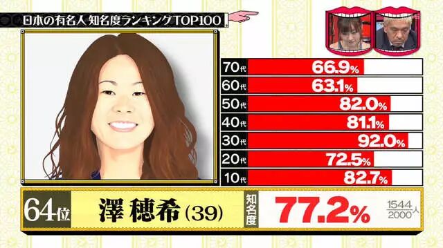 这组全是男性,有滨田雅功在DownTown的搭档松本人志、现役棒球手达比修有、日本喜剧之王志村健、搞笑艺人兼国会议员的东国原英夫、制霸电视的中居正广、日本鹰派首相小泉纯一郎、原摔跤选手并参过政的安东尼奥·猪木。而铃木一朗排在第13,并没有进入前十,节目组做这个调查的愿意是“是否有人比铃木一朗还有名”,那么到底是哪些人比这位日本棒球史上的传奇人物还有名呢?