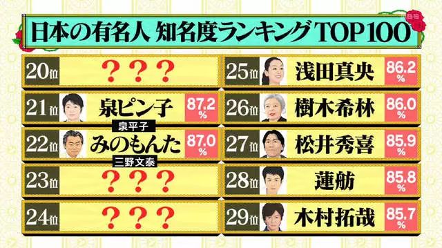 这一组又都是大咖,名人职业分布也比较广泛,曾连续15年被选为“最受欢迎的男艺人“的日剧天王木村拓哉第29;第28的是祖籍台湾,今年刚刚辞任日本最大在野党民进党党首的莲舫,她是唯一一位有华裔背景的日本国会议员;第27位是日本棒球巨星松井秀喜,同样效力过纽约扬基队;第26位是今年74岁的资深女演员树木希林,她曾多次获得过日本奥斯卡奖。花滑名将浅田真央排名第25,是冬季项目运动员的最高排位;第22位是泰斗级综艺主持人三野文太;出演过《阿信》《冷暖人间》等经典日剧的泉品子排名第21,不过她多次被《周刊文春》评选为最不欢迎的女演员。