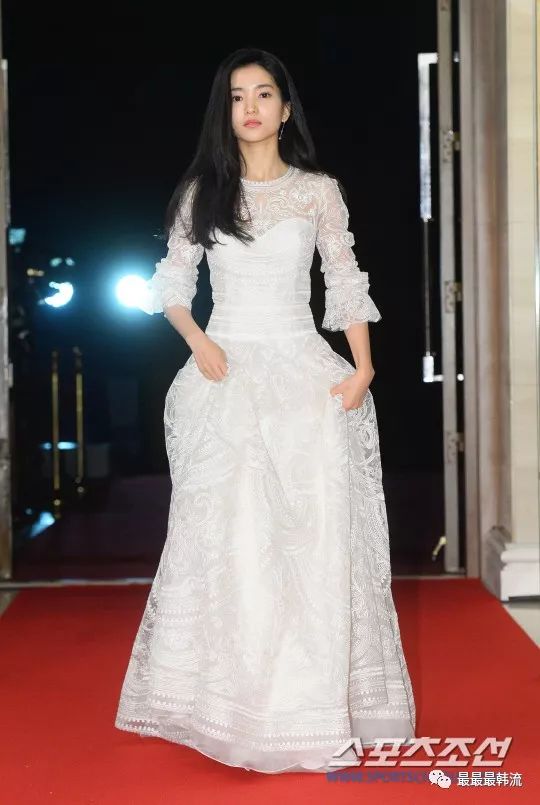 金智媛也选了白色蕾丝礼服,质地和款式都更加女人味儿~