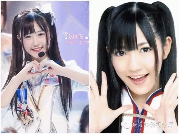 来自上海的费沁源五官精致、相貌可爱,2015年12月正式随SNH48出道,1月因演出团体专属综艺节目《国民美少女》而逐渐受到关注,她的美貌还引起日本媒体惊叹,和前辈鞠婧祎同样被誉为“中国4000年难得一遇的美少女”,还有日本网友称费沁源外型激似AKB48的人气王牌渡边麻友、赞她比“日本千年美少女”桥本环奈还要漂亮。图为费沁源(左)被指激似AKB48渡边麻友(右)