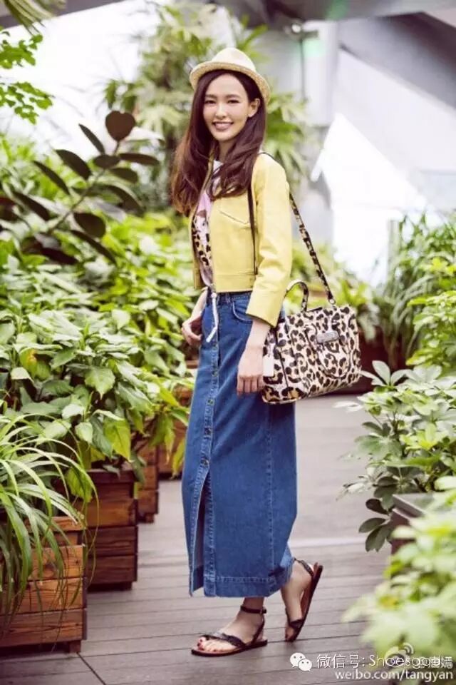 黄色短外套搭配牛仔长裙,挎豹纹小背包,脚踩平底凉鞋,很休闲随性范。
