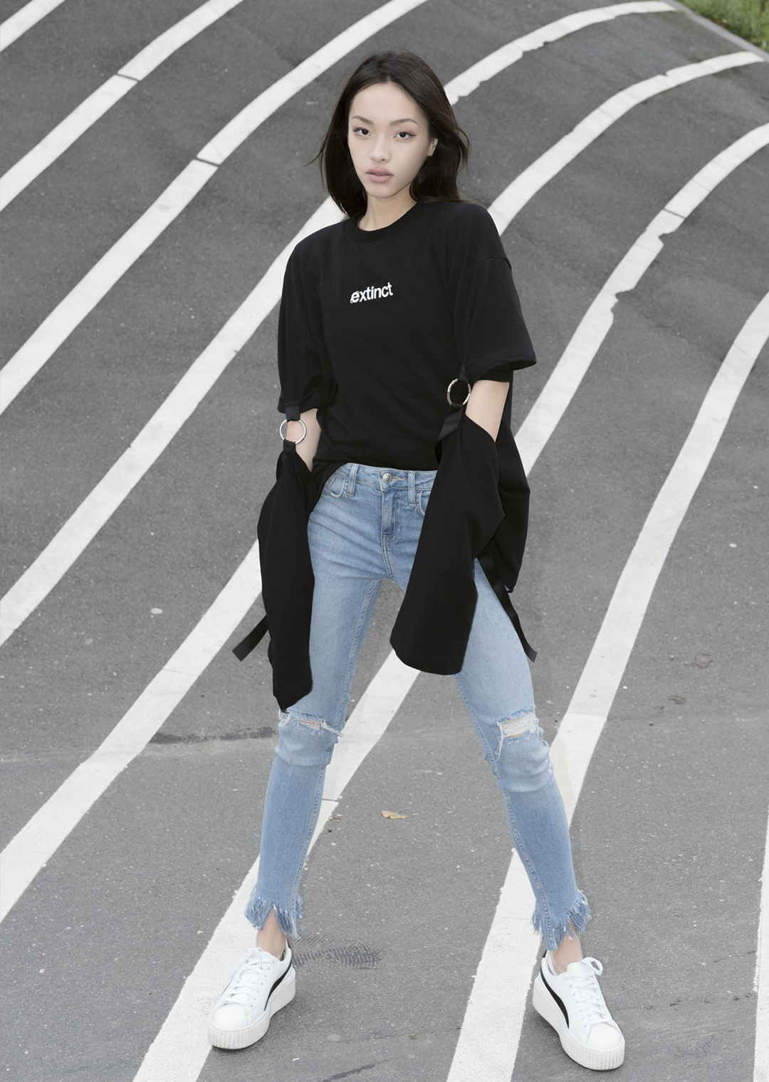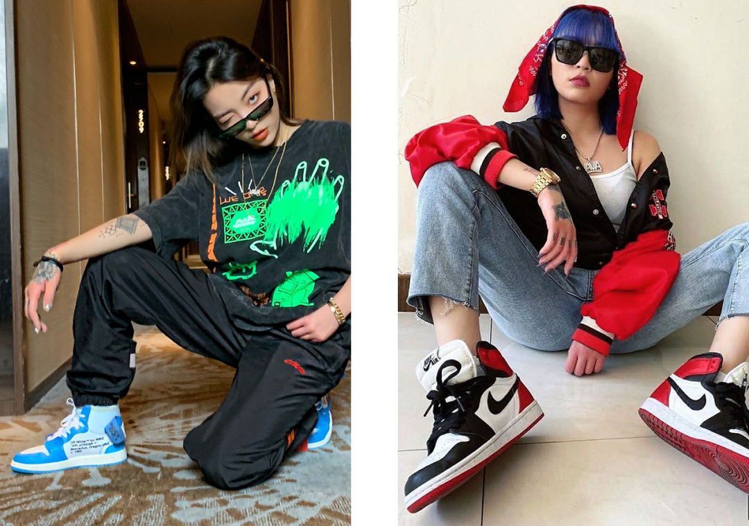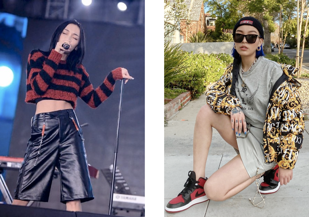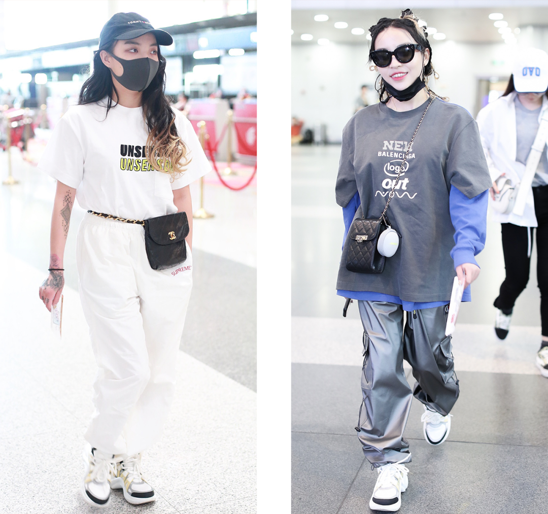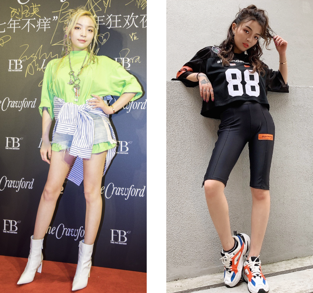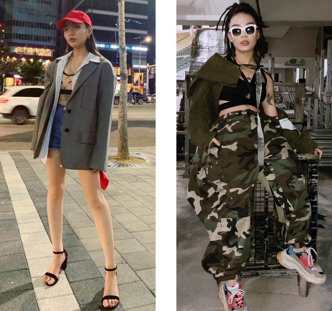 她们会在Oversized上衣、肥裤子、大花纹、半永久大金链等等这些最经典的嘻哈元素里,把一些性感单品加进去,穿得既嚣张又性感,同时还酷、有个性。