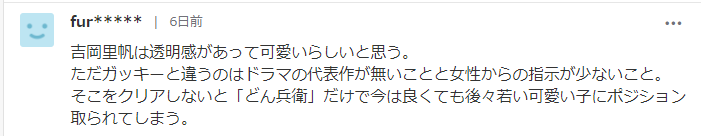 “吉冈里帆确实很清纯可爱,但她和gakki的区别是,她没什么代表作,也不受女性观众喜欢。如果她不认清这点,迟早会被更年轻可爱的女星取代。”