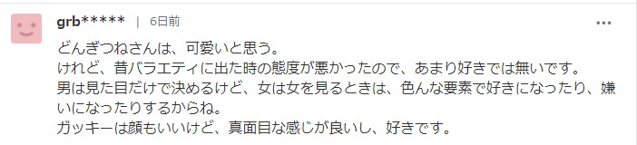 “她很可爱,但之前参加综艺的时候态度不好,对她喜欢不起来,男人只会看外表决定喜欢不喜欢,而女人会从多方面考虑。gakki不仅好看,性格也好,我喜欢她”