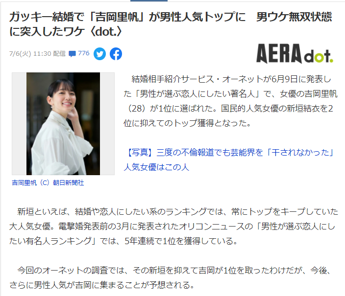 此前,连续5年都是Gakki获得冠军,今年3月宣布与星野源闪婚后,吉冈里帆人气迅速飙升,超越Gakki获得第一名。