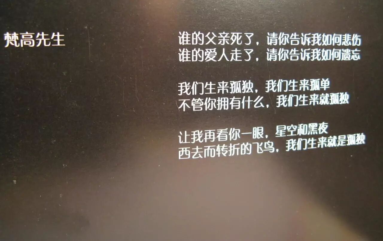 听《梵高先生》,很孤独,很残忍,是一种掉进深渊无法挽回的伤痛。“谁的父亲死了,请你告诉我如何悲伤,谁的爱人走了,请你告诉我如何遗忘,我们生来就是孤独,我们生来就是孤单,不管你拥有什么,我们生来就是孤独......”。这种疑问式的诉说,没有人能回答得上来,回答上来无非又是撕开伤口,悲伤和遗忘,从来没有人告诉我们怎么去做到,只有活生生经历过才能懂得,直击生活的恶毒、残忍、无情,我们不得不面对这样的真相,生来就是孤单,最终也“赤条条来去无牵挂”。
