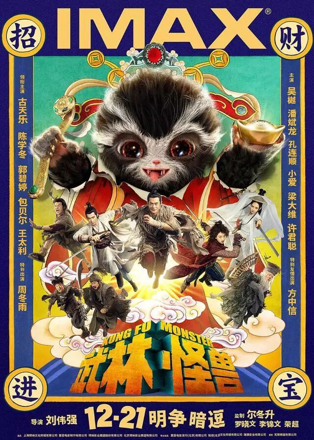 由刘伟强执导,尔冬升、罗晓文、李锦文联合担任监制。古天乐、陈学冬、包贝尔、郭碧婷、王太利领衔主演,周冬雨特别主演的武侠魔幻喜剧片《武林怪兽》,今日官方发布一款IMAX全新海报,众星明争暗逗,搞怪不停,左手金元宝、右手金如意,踏着七彩祥云,角色颠覆搞怪、故事暗藏玄机、怪兽神秘莫测,据悉,影片将于12月21日同步登陆全国IMAX影院