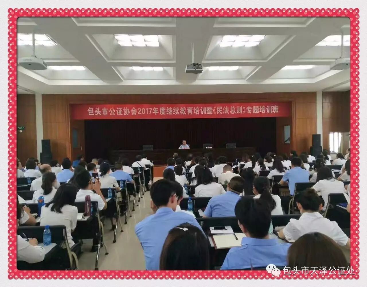 业务培训是传递有效信息、夯实技能素质的重要途径。为提升全市公证人员的业务能力水平和实务操作能力,发现不足,补齐短板,更好地适应新形势下公证行业发展对公证从业人员的要求,2017年7月29日、30日,包头市公证协会邀请中国人民大学民商事法律科学研究中心主任、法学院教授、博士生导师、中国民法学研究会副会长杨立新为全市公证人员带来了《民法总则》的讲座,包头市天泽公证处49名公证人员参加了此次继续教育培训班暨民法总则专题培训班。