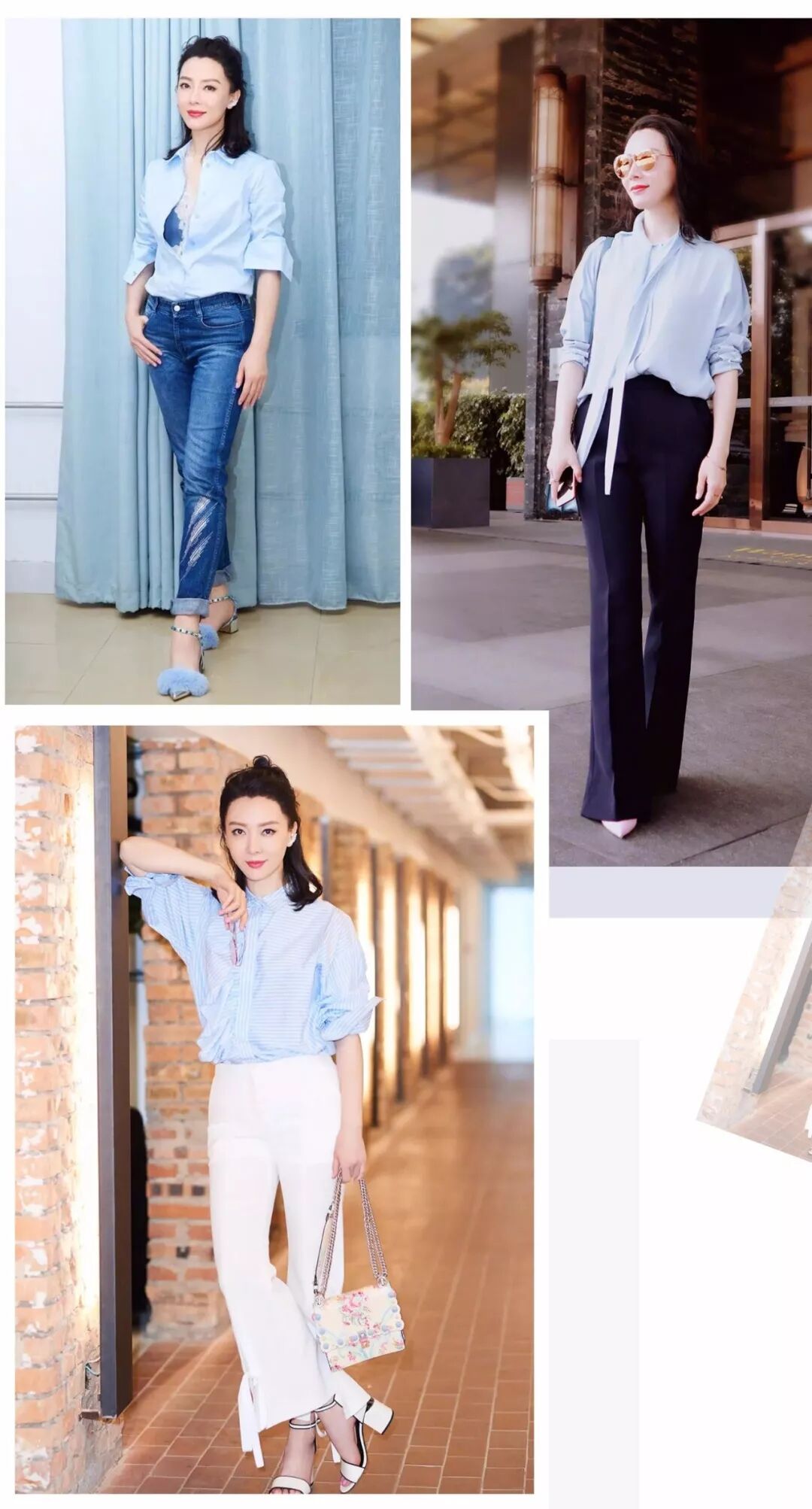 她也有休闲的一面。用衬衣搭配牛仔裤、喇叭裤,整个人都呈现出轻松自然的状态。