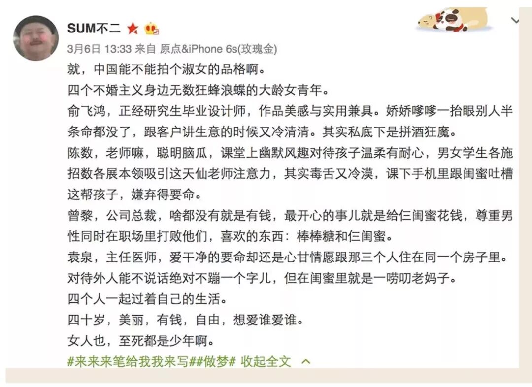 没有混乱狗血的小三小四、婆媳大战,讲的是四位不婚主义的大龄女青年有钱、自由独立、想爱谁爱谁的生活。