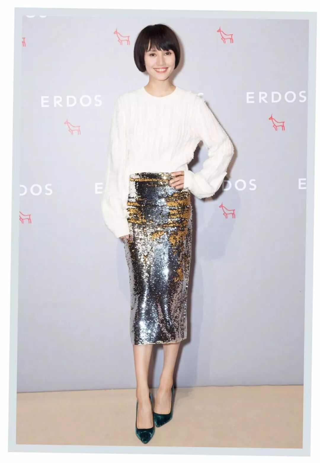金属亮片半身裙非常火,但也容易穿出廉价感。袁泉聪明地用了白色毛衣来打造简约风格,提升整体质感。