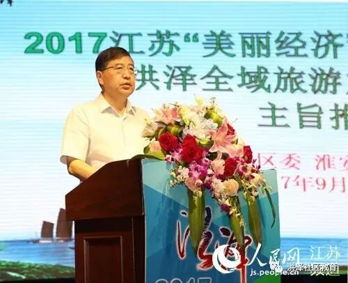 人民网南京9月17日电,17日下午,2017江苏“美丽经济”发展高峰论坛暨洪泽全域旅游发展推介会在南京举行。淮安市洪泽区委书记朱亚文在推介中表示,洪泽将再投资100亿元,重点实施50个生态旅游项目,打造国家级全域旅游示范区。江苏省政协副主席许津荣出席并致辞。