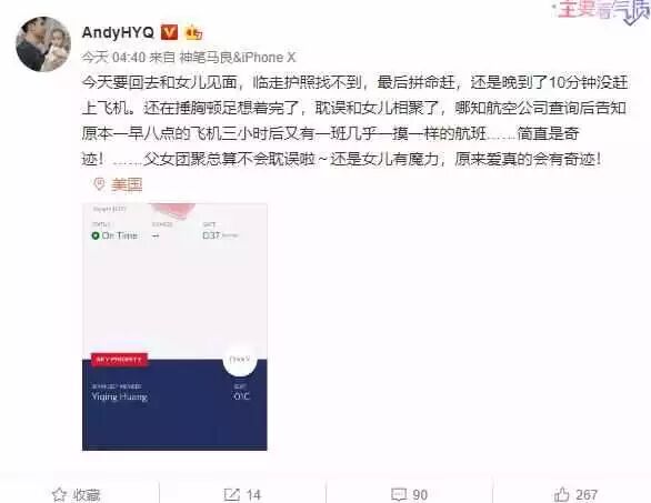 黄毅清在微博中写到:今天要回去和女儿见面,临走护照找不到,最后拼命赶,还是晚到了10分钟没赶上飞机。还在捶胸顿足想着完了,耽误和女儿相聚了,哪知航空公司查询后告知原本一早八点的飞机三小时后又有一班几乎一模一样的航班……简直是奇迹!……父女团聚总算不会耽误啦~还是女儿有魔力,原来爱真的会有奇迹!