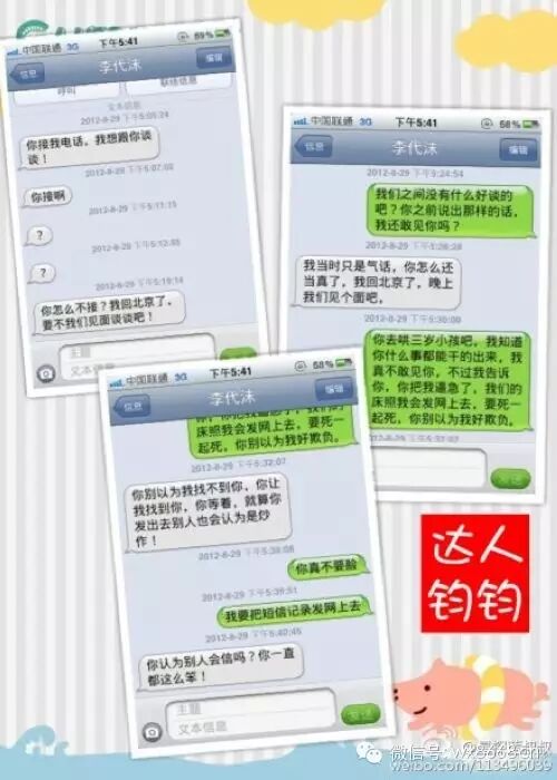 网友“一颗卤蛋”在微博向李代沫“隔空喊话”:“就算你现在火了,把我甩了,我没话可说,同志的感情就是这样,禁不起风雨,你刚刚给我打电话是什么意思?威胁我吗?我家里人已经知道我是同志啦,大不了同归于尽。”并发出多张疑似为两人的照片,引得网友议论纷纷,也有评论认为,私人的感情与唱歌节目无关,公众不应苛责。