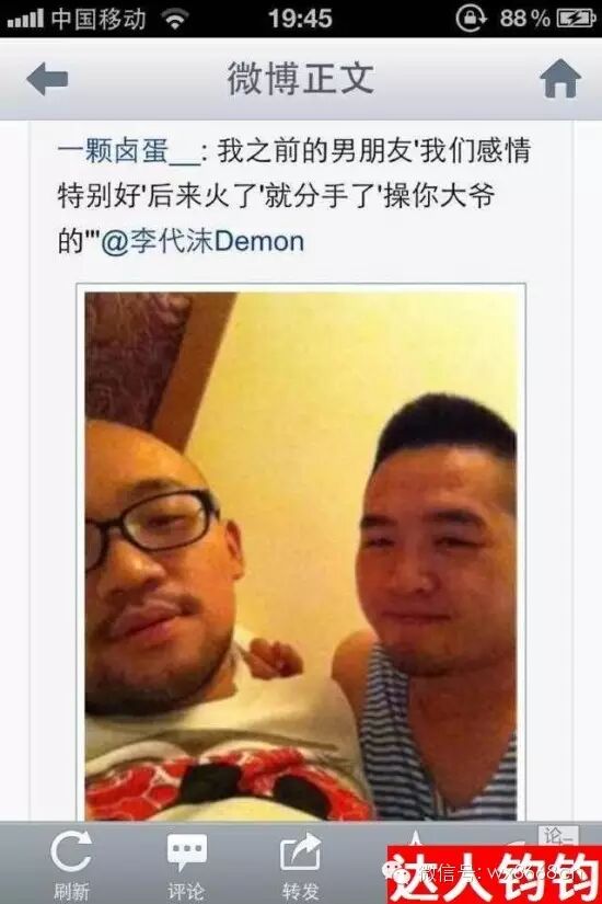李代沫陷同性传闻的时候传闻他前男友一颗卤蛋爆料称: 对李代沫Demon说:就算你现在火了,把我甩了,我没话可说,同志的感情就是这样,禁不起风雨,你刚刚给我打电话是什么意思?威胁我吗?我家里人已经知道我是同志啦,大不了同归于尽关注@非长勿搞惊爆你眼球!就是要你好看!