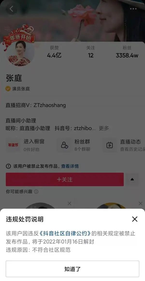 抖音违规处罚说明显示,张庭因违反《抖音社区自律公约》的相关规定被禁止发布作品,违规原因为“不符合社区规范”,将于2022年1月16日解封。记者注意到,张庭抖音账号关闭了私信功能。