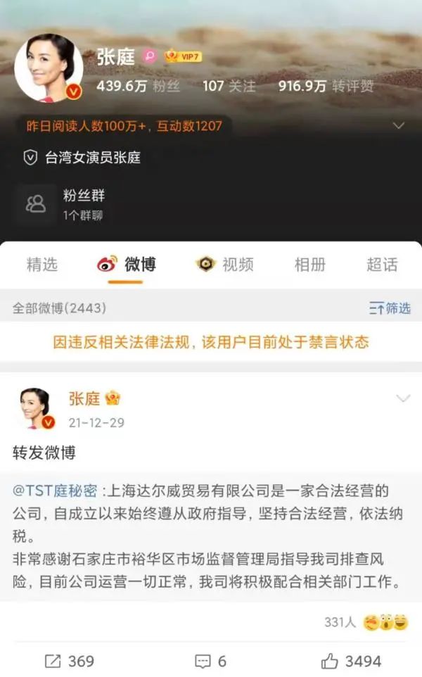 (原标题:张庭微博抖音均被禁言,TST客服称目前公司运营正常)