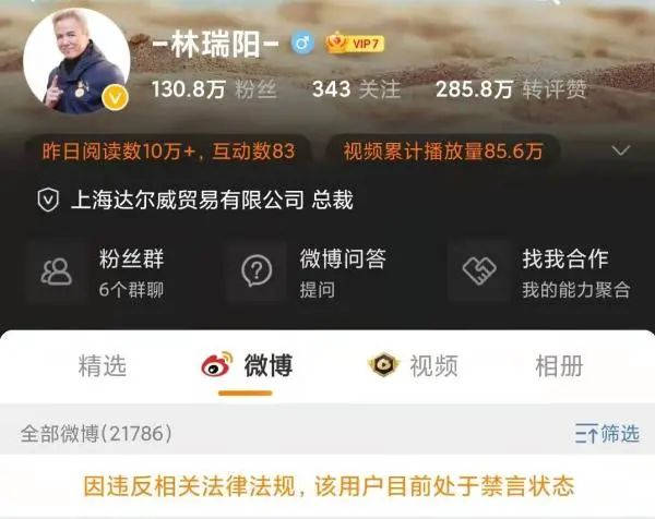 张庭、林瑞阳个人认证微博账号显示,禁言原因均为“违反相关法律法规”。张庭微博粉丝数近440万,抖音粉丝3358万,林瑞阳微博粉丝数量近131万。