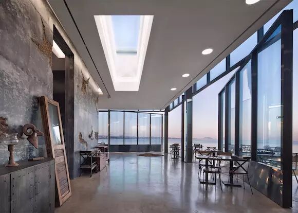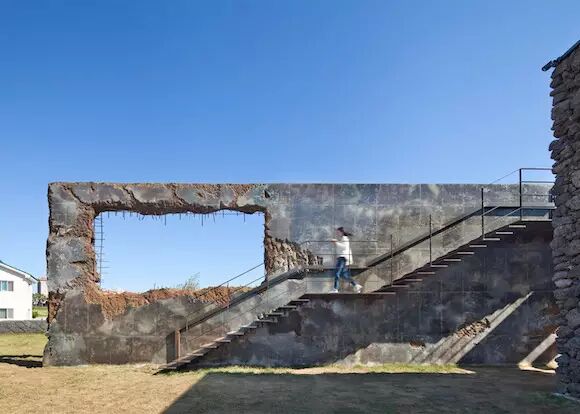 ►整个咖啡馆的建筑主体主要以火山沙、海边岩石、废旧钢板及反光性能突出的大幅玻璃为主要建筑材料——入口及登上屋顶露台的过道围墙都由石头垒成。