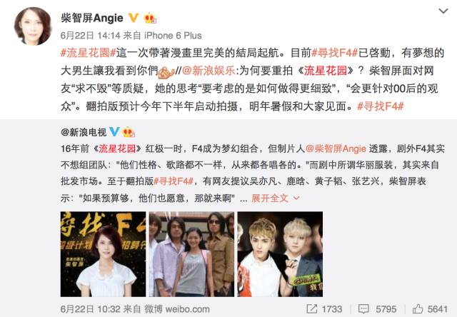 偶像剧女王柴智屏也在不久前宣布将重拍《流星花园》,寻找f4的计划也正式启动,预计明年新版f4就能和大家见面。
