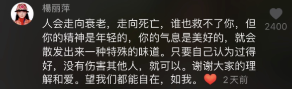人会走向衰老和死亡,谁也救不了你。 但你的精神是年轻的,你的气息是美好的,就会散发出一种特殊的味道。 只要自己认为过得好,没伤害其他人,就可以。