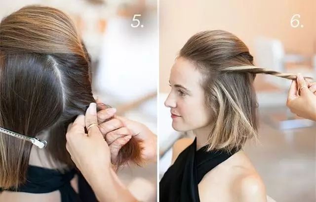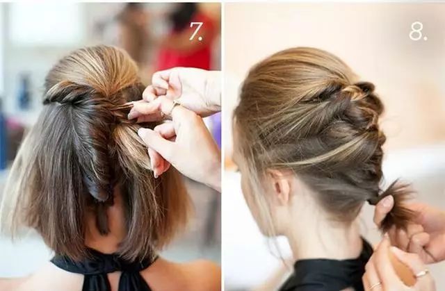 step 7:然后将旁侧缕好的头发一直拉扯到中间的那股头发,潮人必看时尚宝典aassbd,然后用发卡固定。