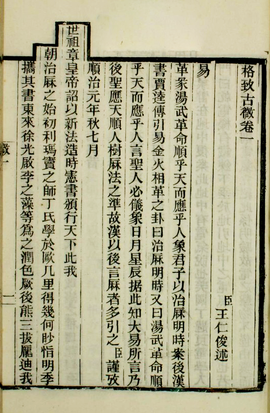 格致之学,纲领著于礼经,条目散见子史,孔庭所授,列诸《大学》。秦烬以前,必有专书,采而辑之,犹存梗概。或谓《格致》一章沦于异域,自是瞽论。