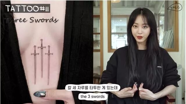 另外,韩艺瑟胸间纹着的三把刀,每把刀代表"力量","勇气"和"保护",此外对于蛇纹身韩艺瑟表示"我想拥有能对付蛇一样狡猾的人的智慧"。