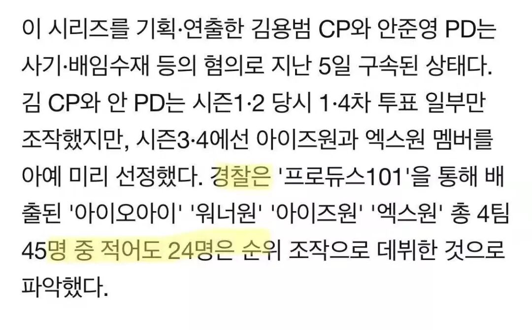 韩国媒体报道,警方掌握到,通过Produce101培养的"IOI","Wanna One","IZONE","X1"共4组45人中,至少有24人通过排名造假出道。