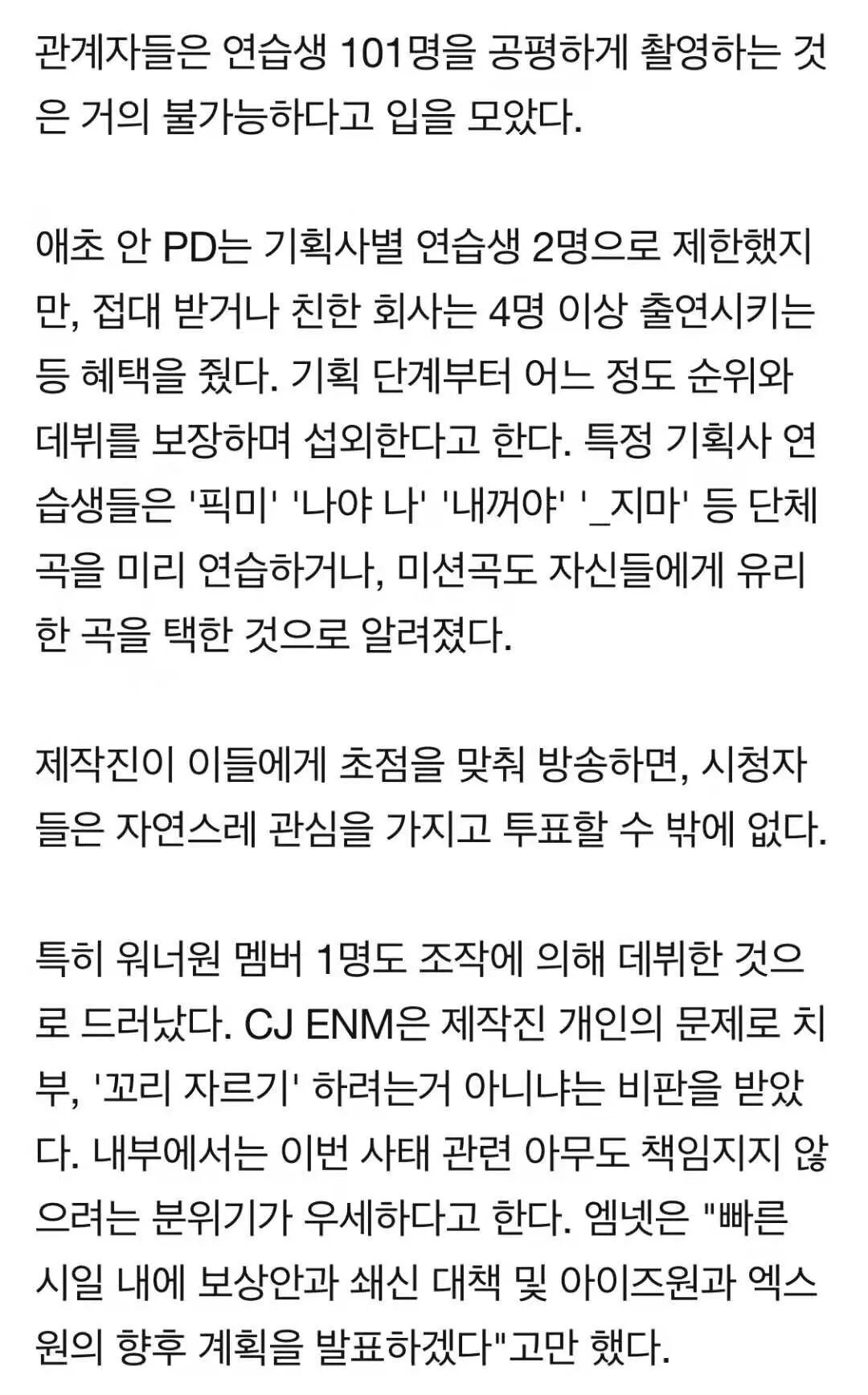 当初安PD限定每个企划公司只能出2名练习生,但是接受了招待或关系好的公司却让4名以上出演等给予了特权。