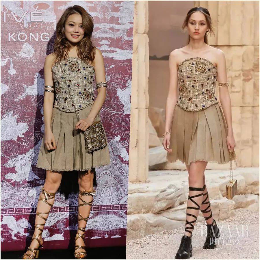 容祖儿身穿CHANEL 2018早春度假系列的浅棕抹胸裙套装,搭配可爱的罗马鞋,让自己的年纪永远定格在了公主。