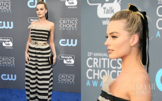 “小丑女”Margot Robbie身穿Chanel荷叶边条纹礼服裙搭配特色盘发甜美迷人,更是荣获最佳喜剧电影女主角