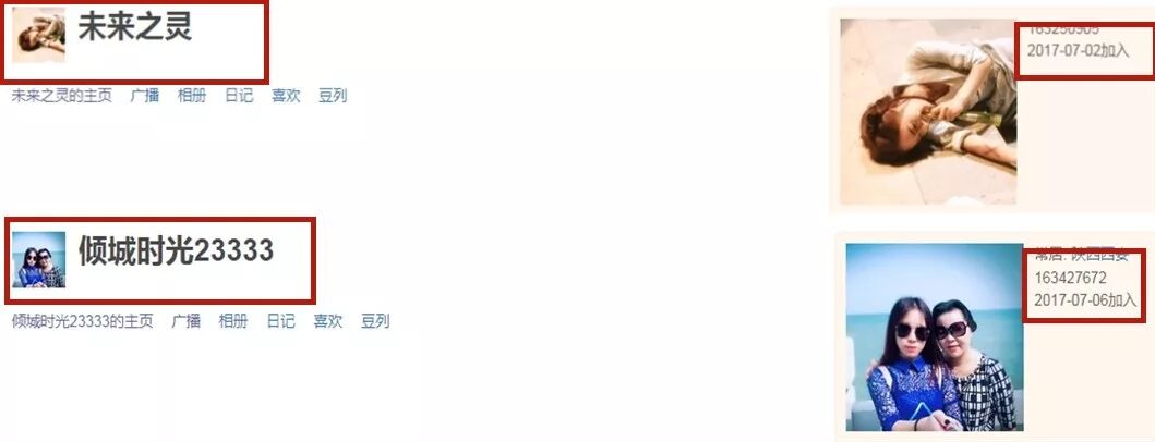 而且“巧合”的是,豆瓣上的这两个“团伙”——未来之灵和倾城时光,入驻豆瓣的时间,刚好跟天涯上的那个小号一样,是在7月初!