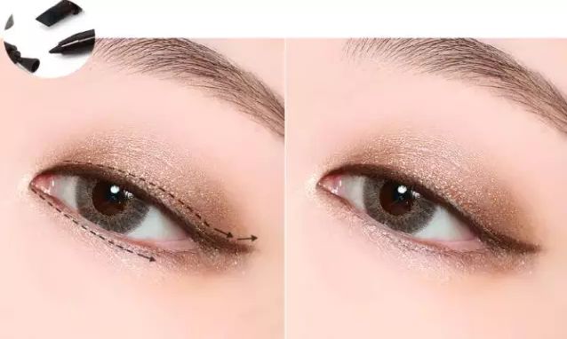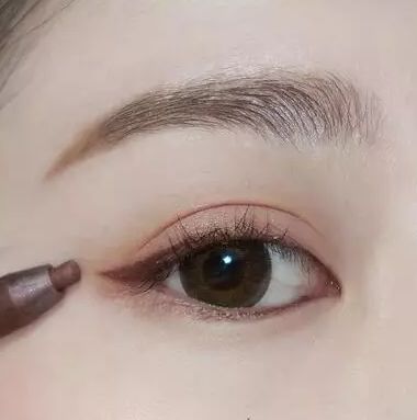 Step3:用棕色眼线笔沿着睫毛根部画一条眼线,眼尾加粗并上翘;