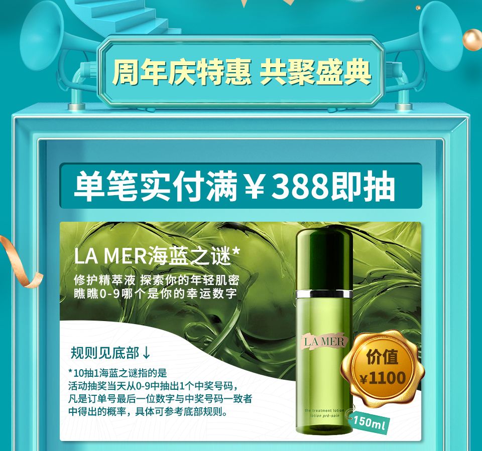 1、单笔订单实付金额满388元即可获得一次抽奖机会,从0-9之间抽取中奖号码,订单尾数一致则判定为中奖;幸运儿将有机会获得LA MER海蓝之谜修护精萃液一瓶
