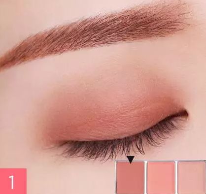 Step 1:用珊瑚色眼影在上眼皮晕染,尤其加重眼窝处,增加眼部立体感;