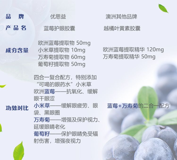 一般眼部保健品都是二合一配方,仅有欧洲蓝莓提取物和万寿菊提取物;而Youthit优思益则是四合一配方,营养更全面且均衡。特别是“可喝的眼药水”小米草,将Youthit优思益产品功效提升到了更高的层次,是其它同类产品可望而不可及的最大优势,性价比非常高。