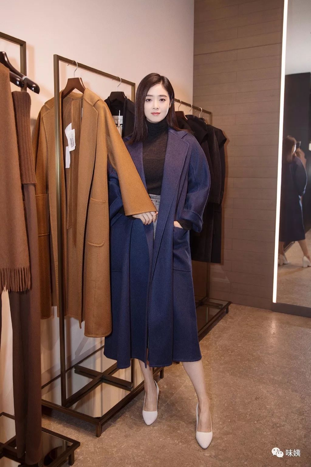 谁说圆脸不能穿高领?蒋欣用黑色高领衫搭配蓝色大衣,深色衣服衬得肤色更白皙了。