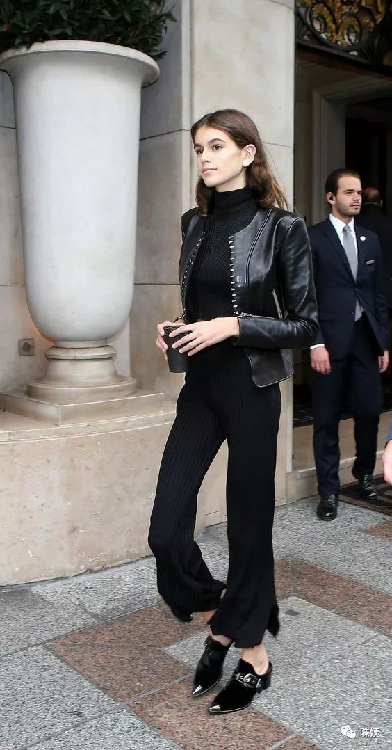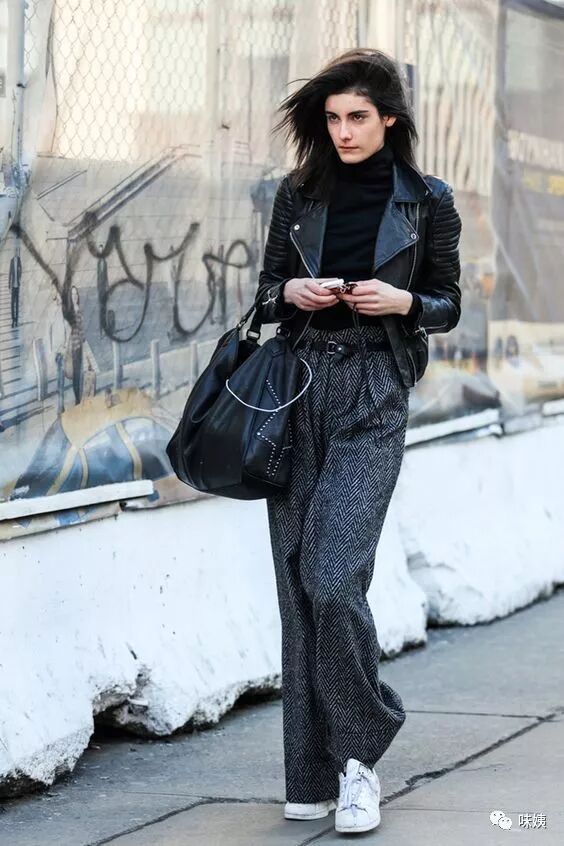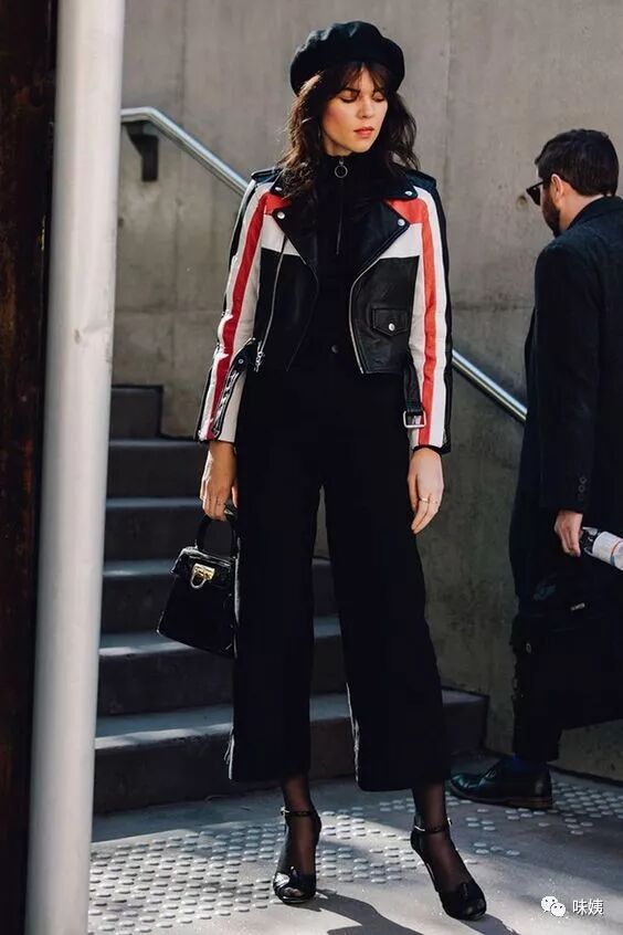 短夹克在秋冬换季时节是保暖又时尚的选择,特别是帅气的黑色皮衣,短款设计显高,all black的搭配也能因为黑色高领衫穿出层次感来。