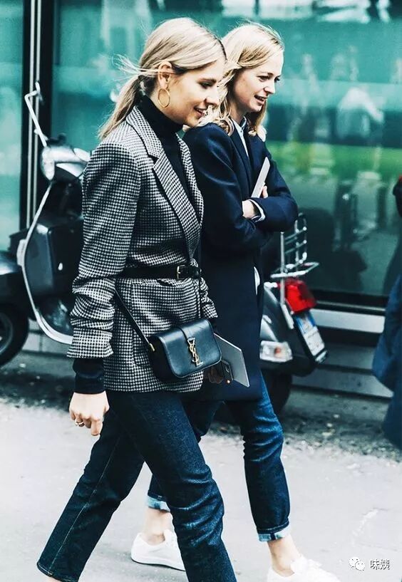 西服外套的正经感也可以用黑色高领衫来中和,V型西服领和小高领的碰撞,更能让西服穿出大气范儿。