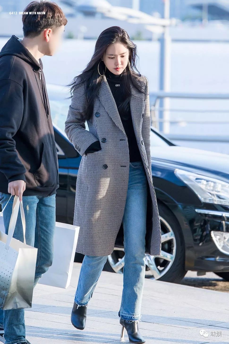 孙娜恩用格纹长大衣搭配黑色高领衫,复古与复古的碰撞,搭配牛仔裤都能气质满满。