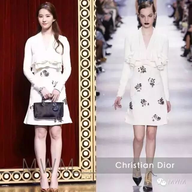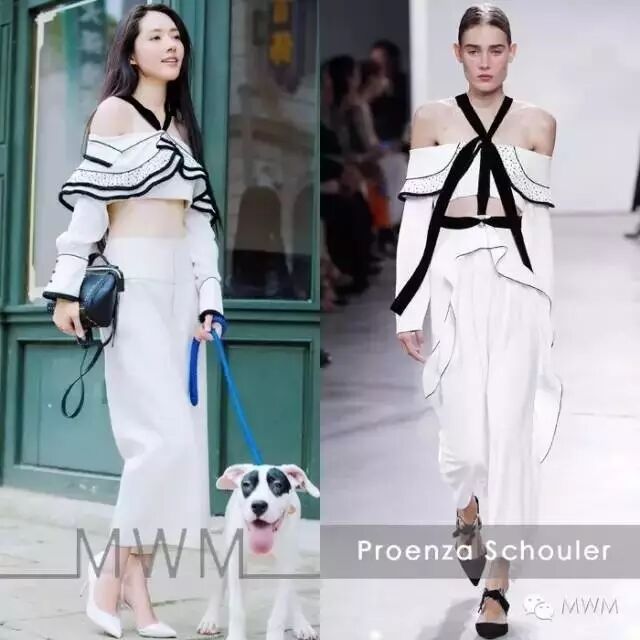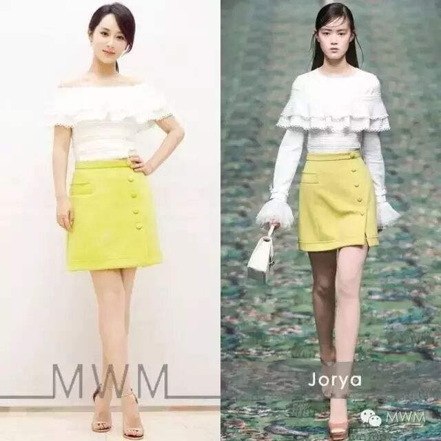 虽然模特的裙子是膝盖以上,高圆圆穿到了膝盖以下(而且看情况她已经尽量往上提了),但是俗话说得好,街拍达人是不会丑的……