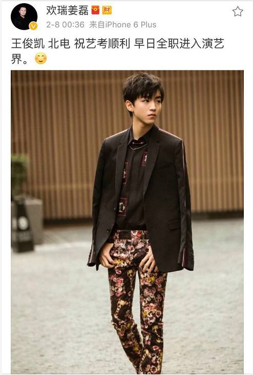 昨天星姐在朋友圈说了今天王俊凯参加北电的考试,就连欢瑞世纪的副总裁姜磊半夜在微博祝福王俊凯早日全职进入演艺界。