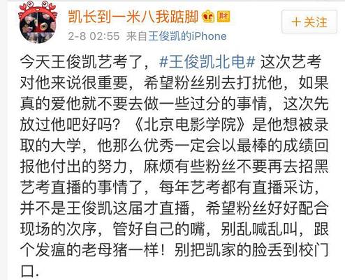 考虑到王俊凯的人气和考试的重要性,希望粉丝为自己的偶像加油,不要去现场围堵。