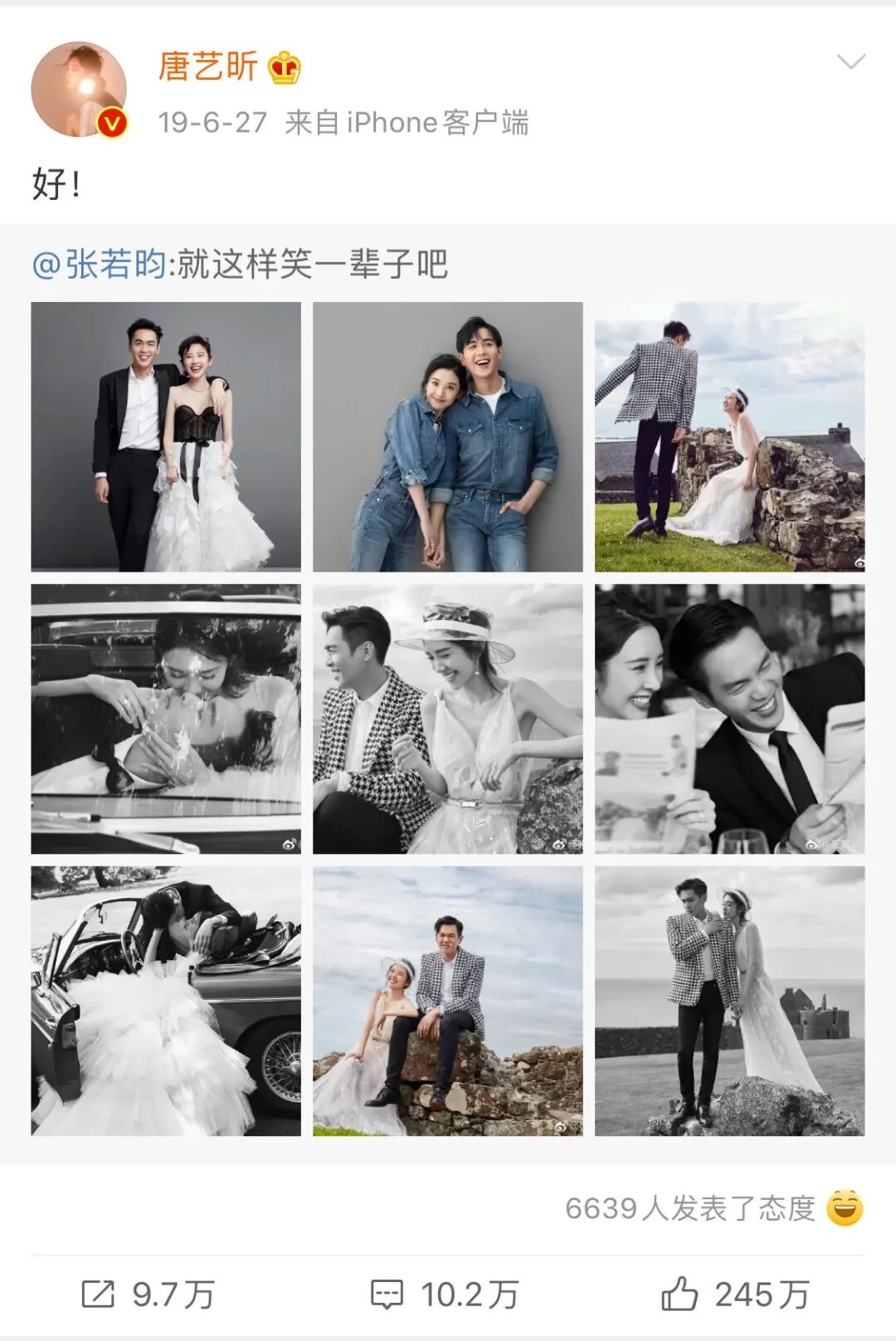 2019年6月27日,唐艺昕和张若昀宣布结婚。