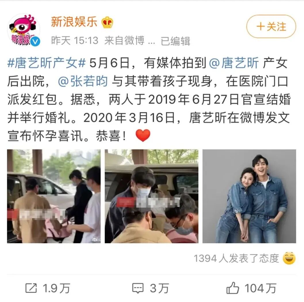 2020年3月16日,唐艺昕在微博宣布怀孕喜讯,以后就是甜蜜的一家三口了,恭喜!