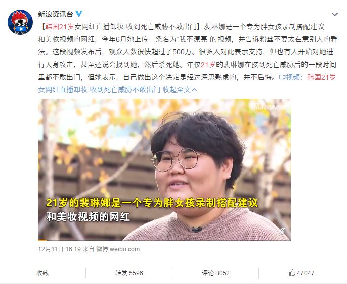 前阵子韩国一个21岁的女网红裴琳娜在网上上传了一个名为“我不漂亮”的短视频。