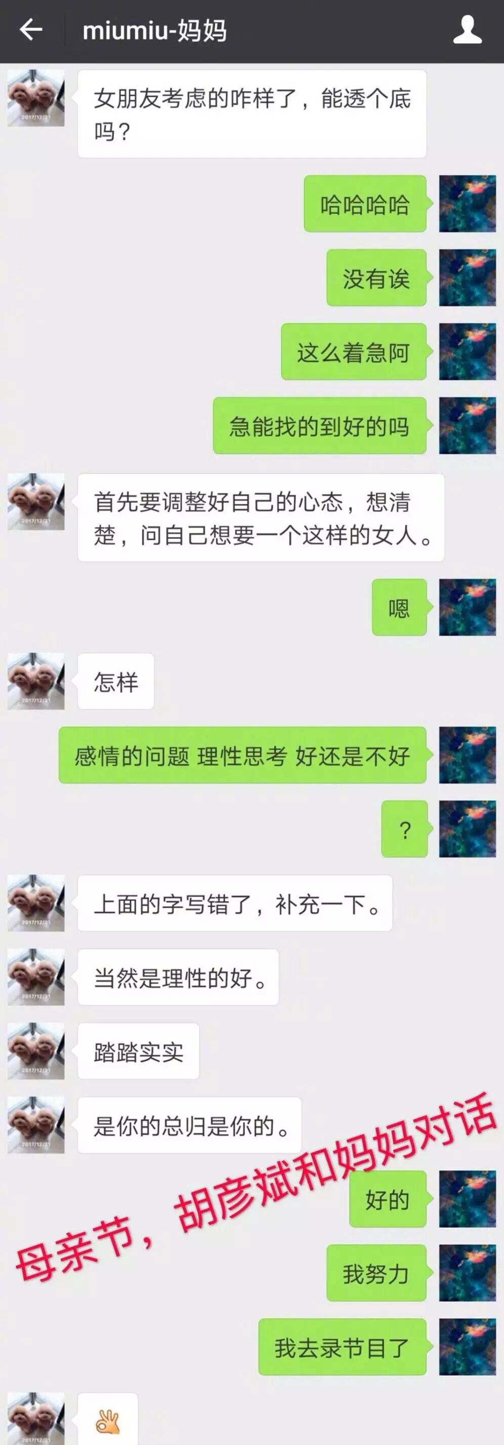 随后也有流出母亲节的时候胡彦斌和妈妈的对话,胡母催儿子赶紧找女朋友,胡彦斌回复:“急能找到好的吗?”“感情的问题,理性思考好还是不好”。